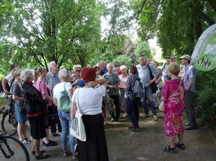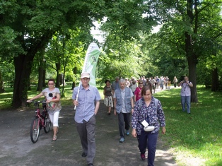 Pierwszą (16 lipca) rozpoczęliśmy przy wejściu od ulicy Inżynierskiej w Parku Poniatowskiego. I na mnie i na uczestników czekała niespodzianka - lokalna telewizja, która wieczorem zaprezentowała skrót z wycieczki. Można zobaczyc to tu: https://lodz.tvp.pl/33237896/16072017-1830 (info o spacerze ok 9min 10 sek). Spacer prowadził terenami dawnego "Ogrodu przy Pańskiej", który wówczas obejmował tereny obecnego parku, część terenów zagodpodarowanych na potrzeby szpitala im. WAM, część obecnego dworca Łódź Kaliska oraz parcelę na której wybudowano kościół pw. Matki Boskiej Zwycięskiej (który wybudowano jako wotum za zwycięstwo w wojnie polsko-bolszewickiej). Mówiliśmy zarówno o zmianach w zagospodarowaniu parku od jego powstania do dziś jak również o jego obecnej rewitalizacji. Największą furorę zrobiła i tak glediczja trójcierniowa, jedno z rzadkich drzew rosnących w naszym parku.